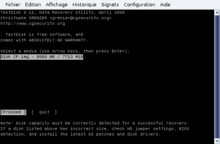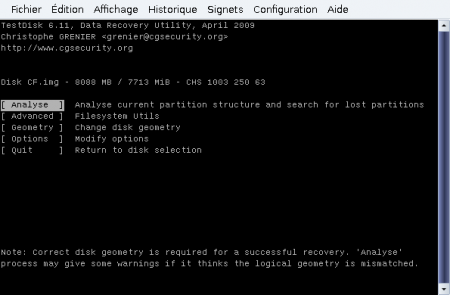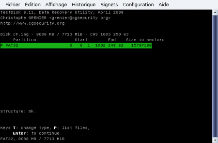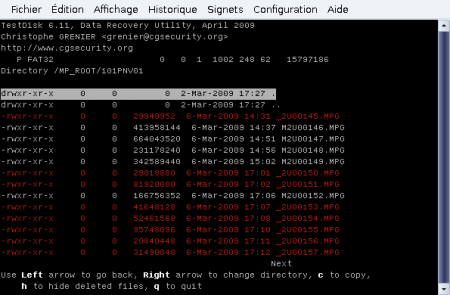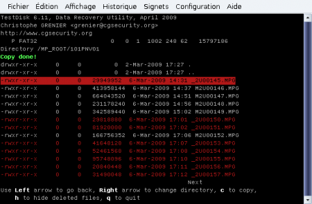 Testdisk est un logiciel très puissant dont cet exemple n’illustre qu’une des fonctionnalités. Il est accompagné d’une documentation fournie, généralement placée dans file:///usr/share/doc/testdisk/test....