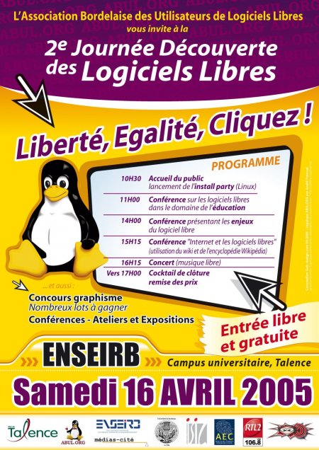 Samedi 16 avril 2005 se déroulera de 10h30 à 17h30 la deuxième édition de la Journée Découverte des Logiciels Libres