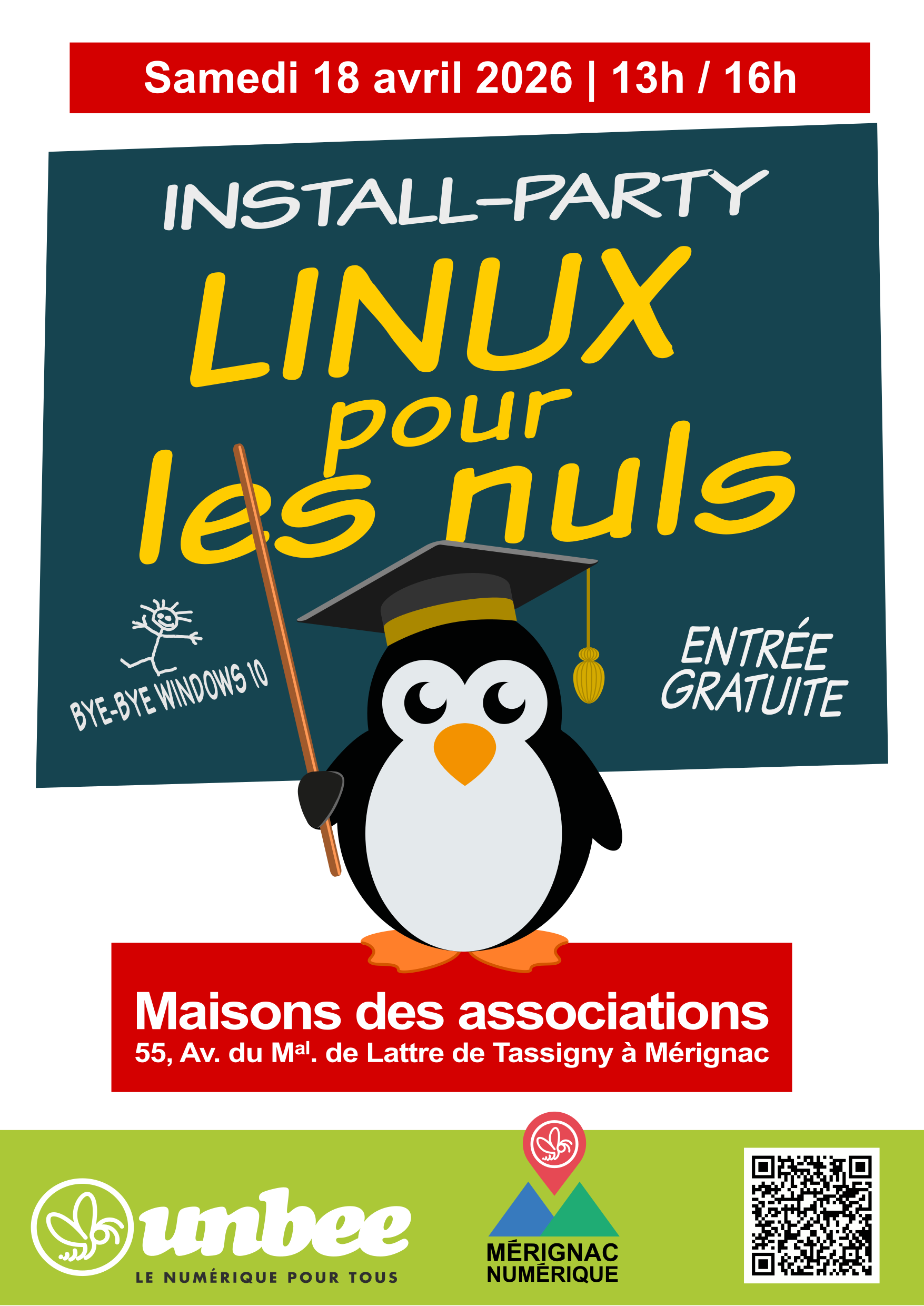 L’association Unbee organise une install-partie GNU-Linux et des activités autour des logiciels libres samedi 18 avril 2026 de 13h à 16h à la Maison des Associations, 55 avenue du maréchal de Lattre de Tassigny 33700 Mérignac